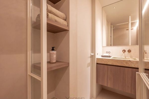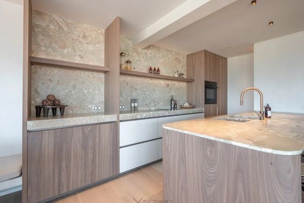 Het appartement werd tot in de puntjes afgewerkt met hoogwaardige materialen: strakke technieken in de wandafwerking, verfijnde marmeren accenten en design details die overal terugkomen.