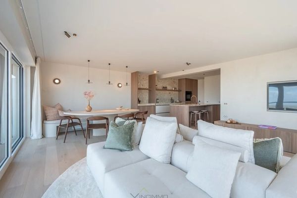 Bij het binnenkomen vindt u een stijlvolle inkomhal met gastentoilet. De royale leefruimte baadt in het licht dankzij de vele raampartijen en biedt een ononderbroken zicht op de zee. Aansluitend bevindt zich een volledig uitgeruste open keuken, ontworpen met oog voor comfort en verfijning.
